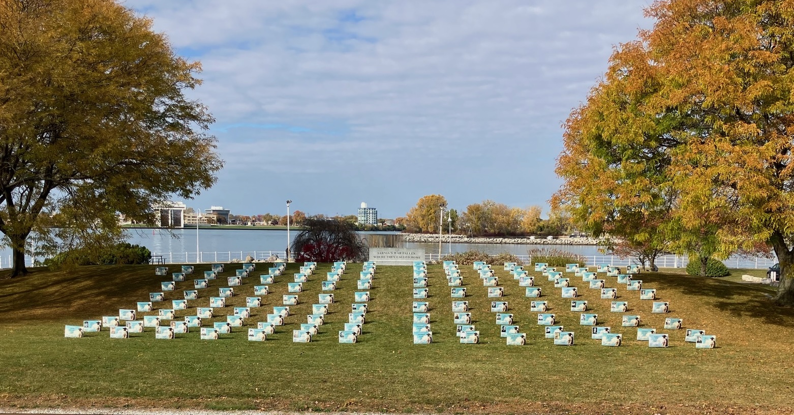 In 2024, we confirmed the addresses of approximately 250 local fallen soldiers. This year, we are displaying 315 signs that represent one sign for every fallen soldier from Sarnia and the surrounding area whose names are inscribed on the Veterans Park cenotaph.