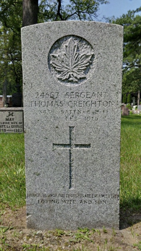 Thomas Creighton, 38, is buried in Our Lady of Mercy Roman Catholic Cemetery, Sarnia. On his headstone are inscribed the words THOUGH FAR AWAY OUR THOUGHTS ARE EVER WITH THEE LOVING WIFE AND SON.