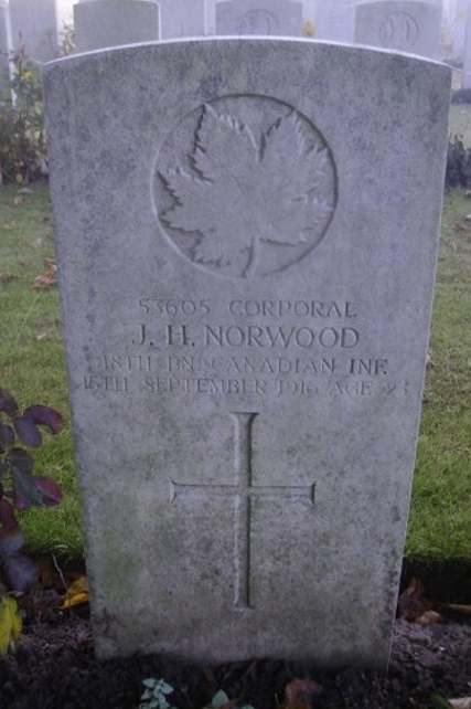 James Norwood, 22, is buried in Serre Road Cemetery No. 2, Somme, France, Grave XXXV.C.4. He was posthumously awarded the Canadian Memorial Cross Medal.