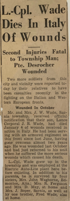 On October 18, 1944, Evelyn Wade of R.R. #1, Sarnia, received the following telegram from the Director of Records in Ottawa: MINISTER OF NATIONAL DEFENCE SINCERELY REGRETS TO INFORM YOU A105041 PRIVATE JOHN ROBERT WADE HAS BEEN OFFICIALLY REPORTED SLIGHTLY WOUNDED IN ACTION ELEVENTH OCTOBER 1944 NATURE OF WOUNDS NOT YET AVAILABLE STOP WHEN ADDRESSING MAIL ADD WORDS IN HOSPITAL IN BOLD LETTERS AFTER NAME OF UNIT FOR QUICK DELIVERY STOP IF FURTHER INFORMATION BECOMES AVAILABLE IT WILL BE FORWARDED AS SOON AS RECEIVED.