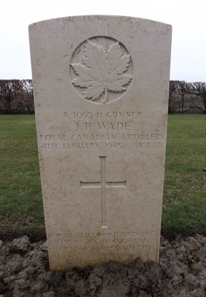 On January 7, 1945, Evelyn received another telegram from the Director of Records in Ottawa: REGRET DEEPLY A105041 PRIVATE JOHN ROBERT WADE HAS NOW BEEN OFFICIALLY REPORTED TO HAVE DIED OF WOUNDS FOURTH JANUARY 1945 STOP YOU WILL RECEIVE FURTHER DETAILS BY MAIL DIRECT FROM THE UNIT IN THE THEATRE OF WAR.