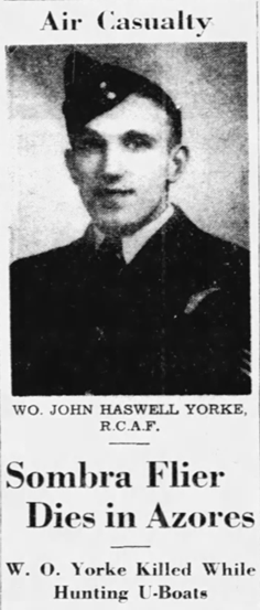 Like his father, a WWI veteran, and his older brother in WWII, John Haswell Yorke served his country in war. When John was killed in action in the Azores in December 1943, the airman became the first World War II casualty from Sombra.